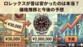 中古市場での販売価格や買取価格は、トレンドや世界的な経済状況によって常に変動します。ここに記載している資産価値に関する内容はあくまで一般的な目安です。購入の際、投資目的や資産性の維持を第一に考える場合は、正確な市場動向を専門店や公式サイトでご確認いただき、最終的な判断は専門家にご相談ください。