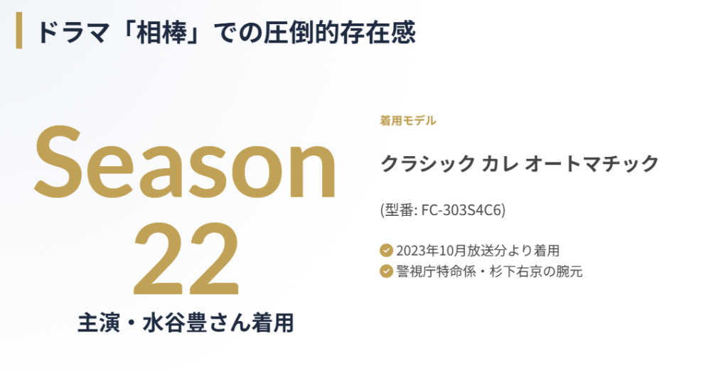 日本のテレビドラマ史において、金字塔とも言える圧倒的な人気と長寿を誇る刑事ドラマ「相棒」シリーズ。その中で、主演の水谷豊さんが演じる警視庁特命係の杉下右京がフレデリックコンスタントを着用していたことは、時計ファンの間でも非常に大きな話題になりましたね。具体的な着用情報として、2023年10月に放送が開始された「相棒 season22」において、杉下右京の腕元には「クラシック カレ オートマチック(FC-303S4C6)」が燦然と輝いていました。