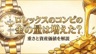 ロレックス ロレックスのコンビの金の量は増えた?重さと資産価値を解説 昔に比べてロレックスのコンビの金の量は増えたという噂の真相を、時計愛好家が徹底解説します。ブレスレットが中空から無垢構造へと進化した歴史的背景や、具体的に推計されるグラム数を詳しく検証。昨今の金相場高騰によるロレックスのコンビの金の量と資産価値への影響もわかりやすく紹介します。 2026.02.28 ロレックス